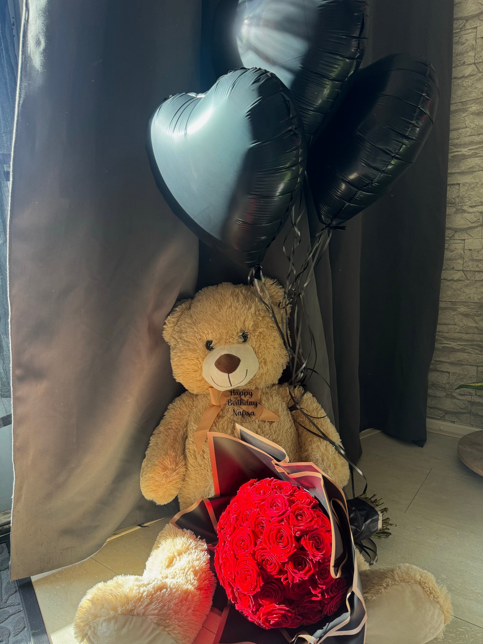 Ons cadeaupakket is de perfecte keuze! Het bevat een boeket van 50 rode rozen, een 100 cm knuffelbeer met een persoonlijke AYCRL-tag, en drie heliumballonnen. Maak het helemaal speciaal door zelf de tekst en kleuren te kiezen.