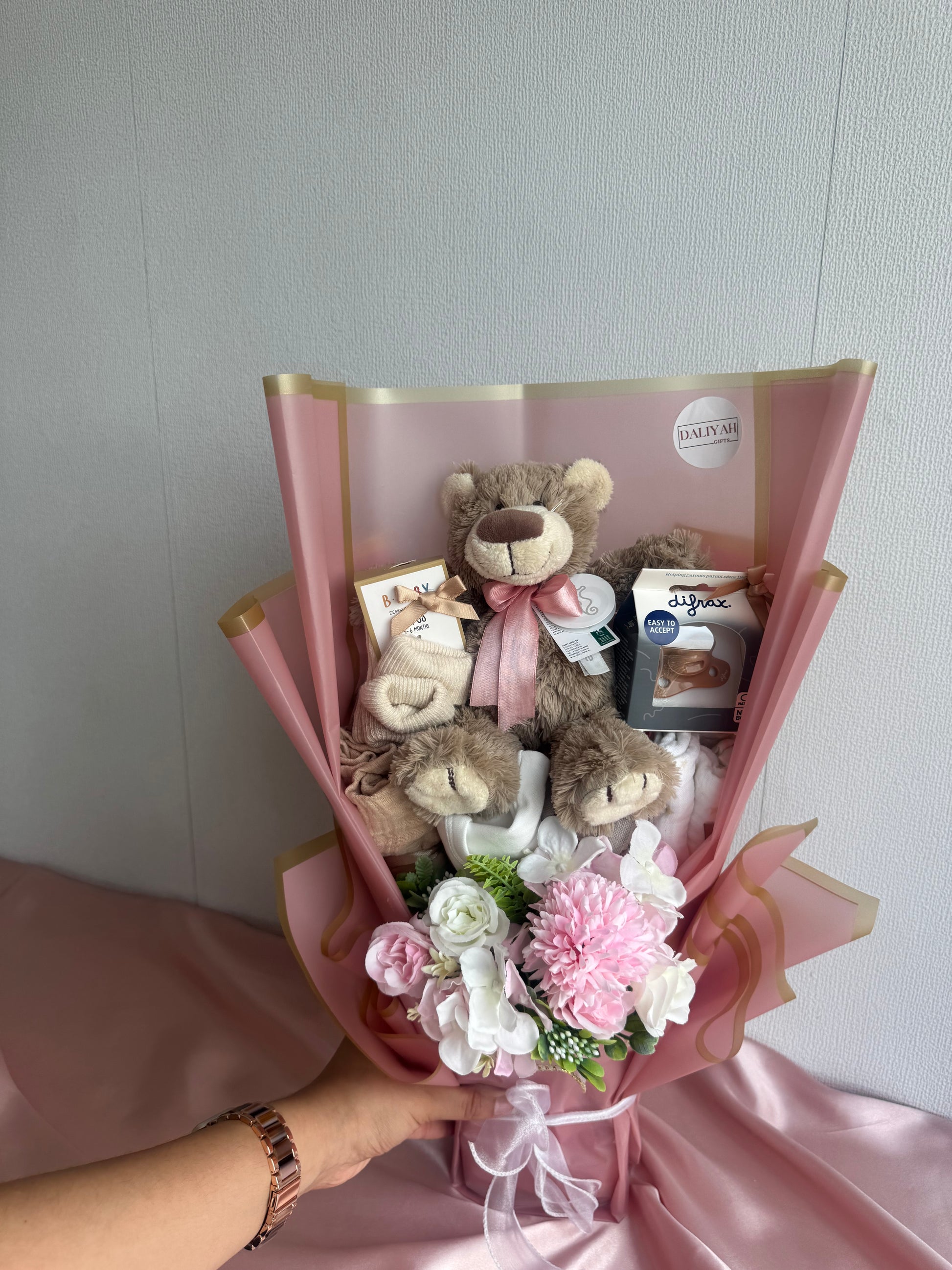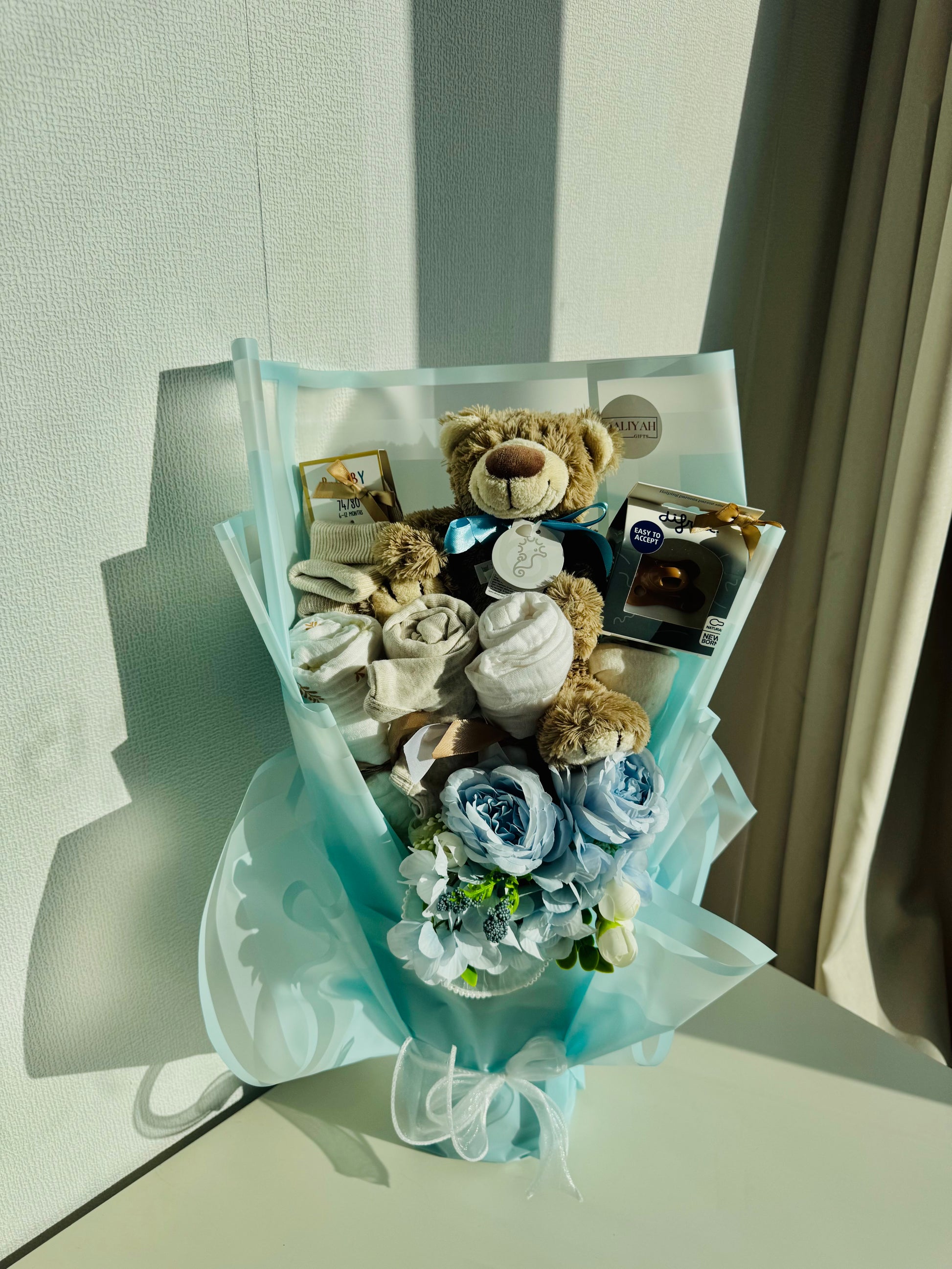Dit luxe babyboeket is de perfecte keuze. Het is een echte eyecatcher voor elke babyshower of kraambezoek en is direct klaar om cadeau te geven. De geboorteboeket bevat kunstbloemen.
