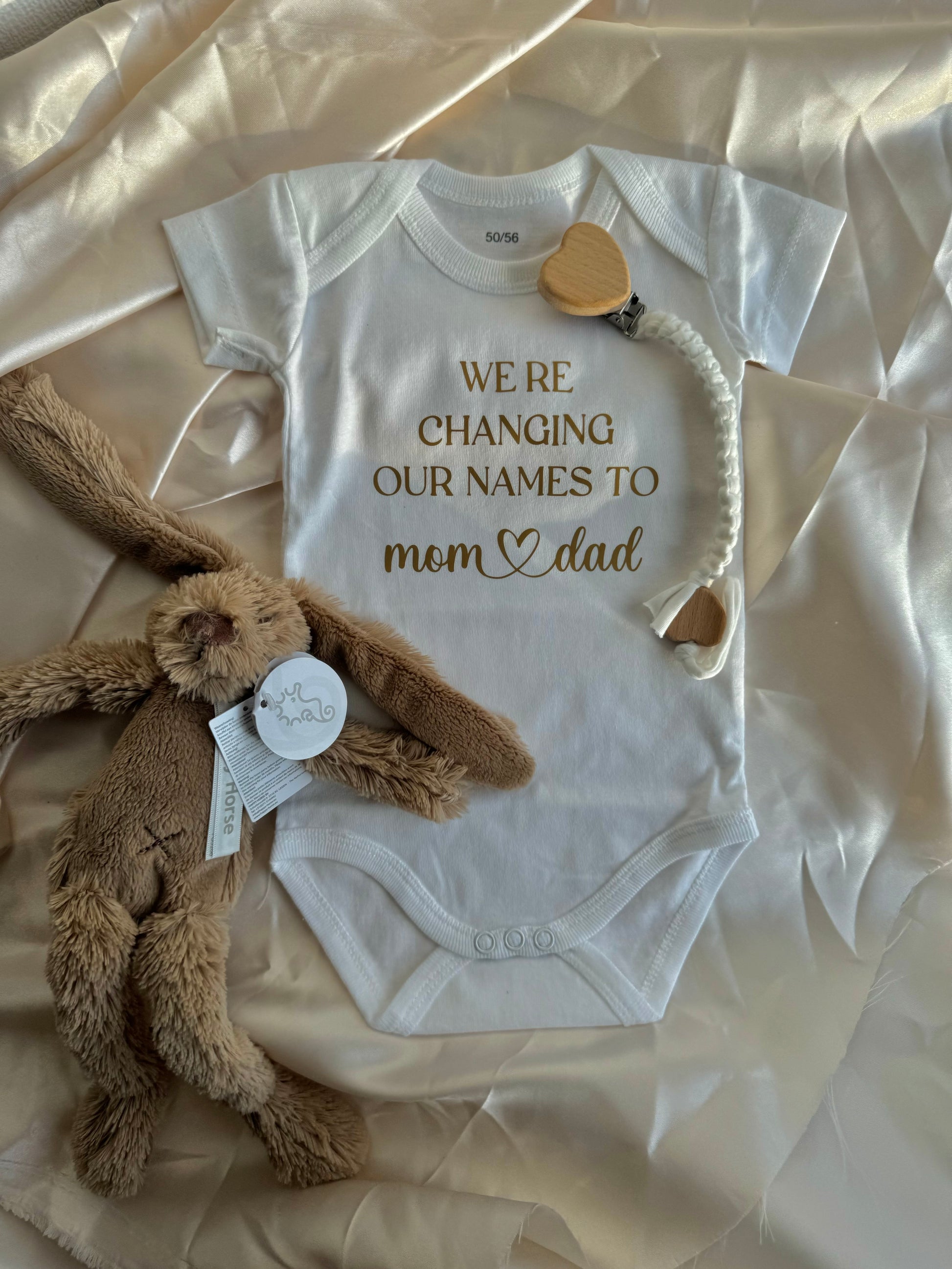Faites savoir à tout le monde qu'un petit est en route avec notre adorable barboteuse ! Nous annonçons fièrement notre grossesse avec le texte « Nous changeons nos noms en Maman et Papa ». Fabriqué en coton doux et disponible en différentes tailles. Un cadeau parfait pour les futurs parents ou pour partager votre propre heureuse nouvelle !