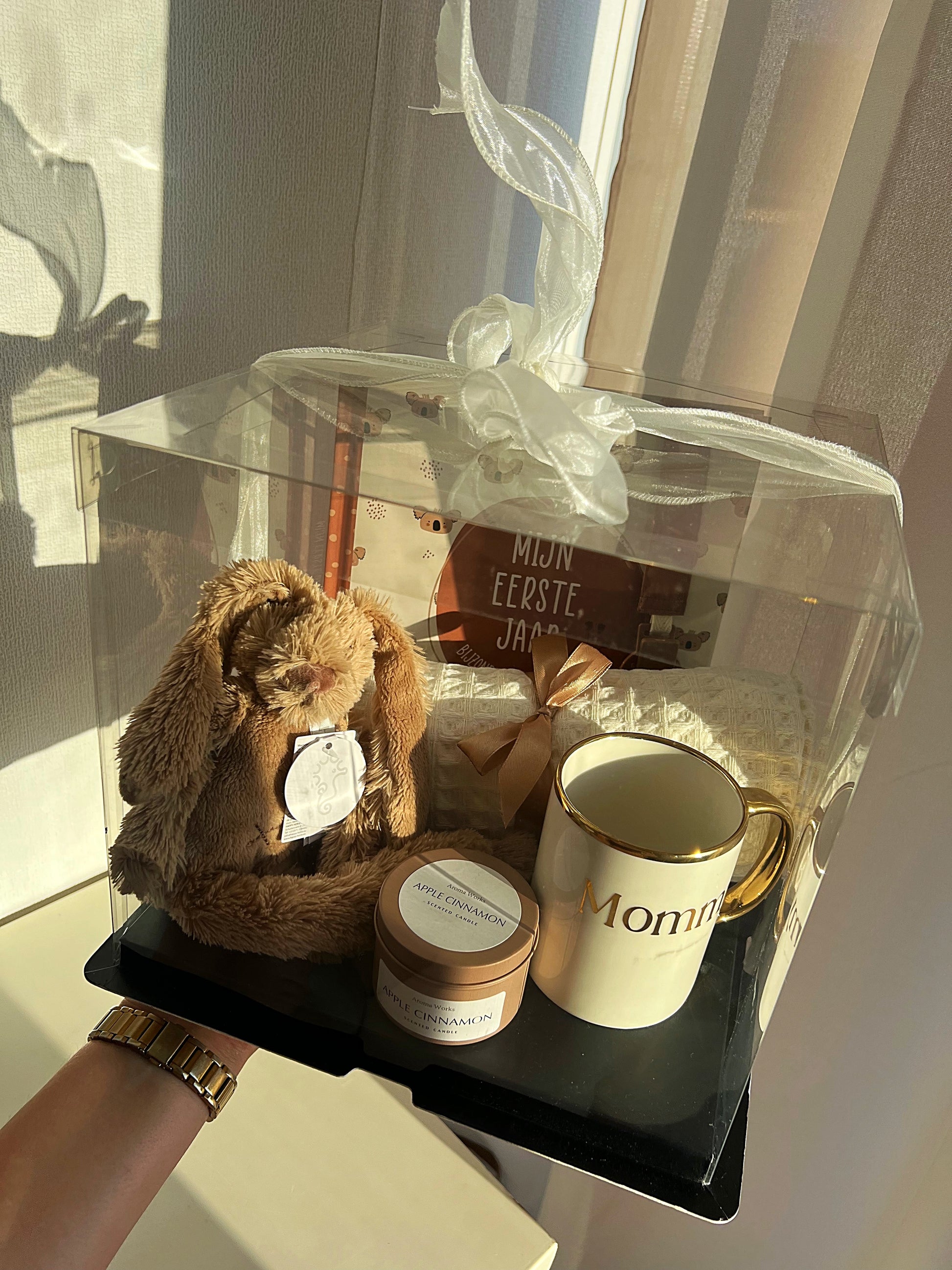 Ce joli coffret cadeau est rempli d'un doudou, d'une peluche cheval joyeux, d'un mug avec le texte "maman", d'une bougie parfumée, d'un livret de première année et d'un attache tétine.