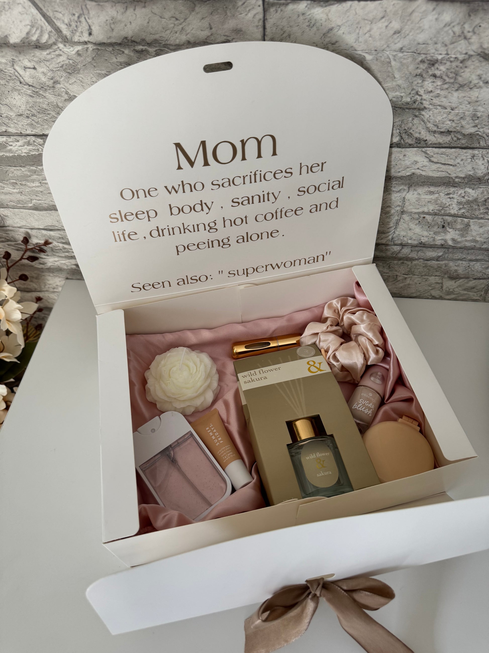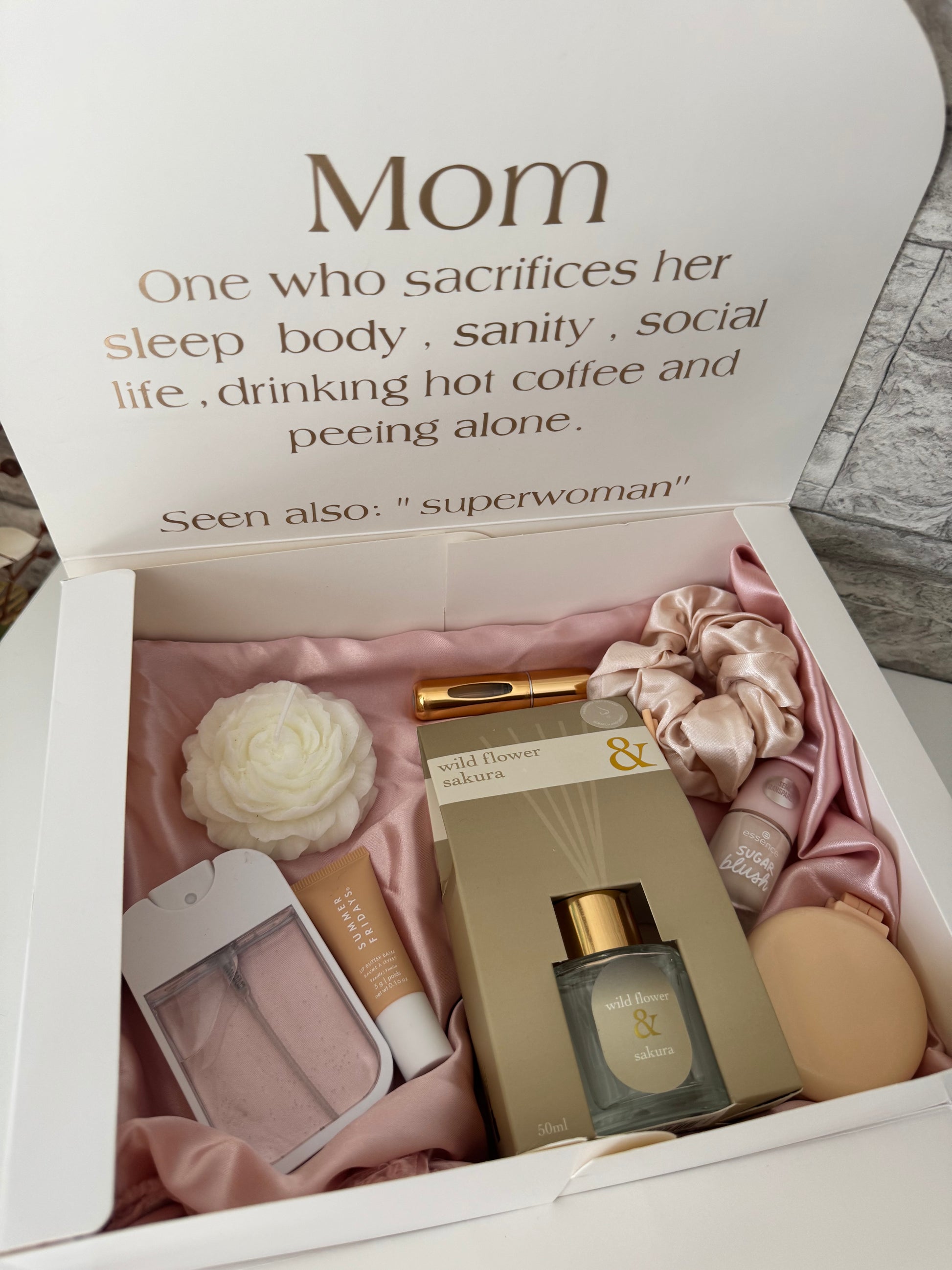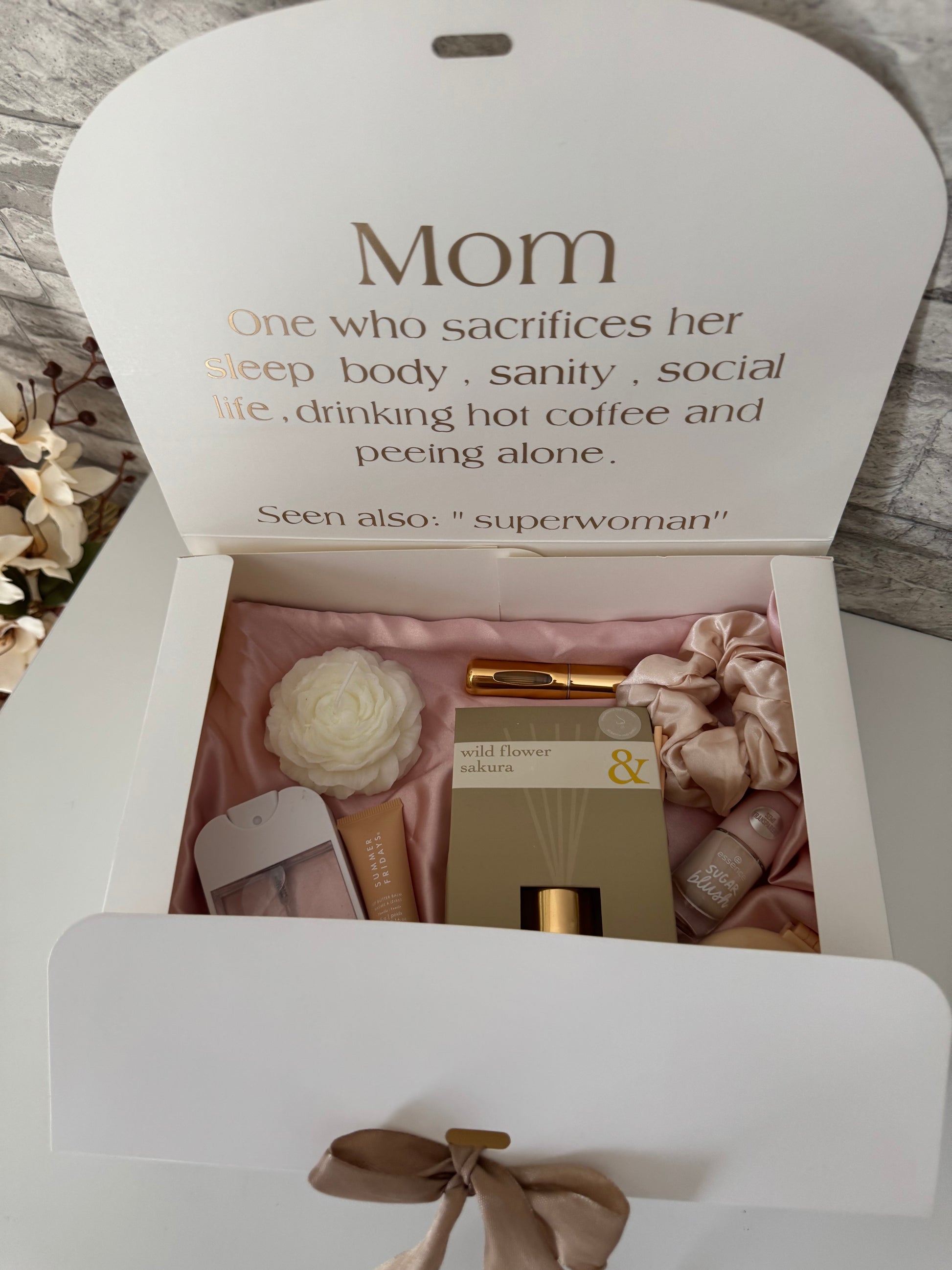 Deze giftbox bevat de ultieme must-haves voor in de tas. Geurstokjes, lipbutter, een satijnen scrunchie, parfum, een spiegel, nagellak en handdesinfecterende spray – alles wat je nodig hebt voor een verfrissing onderweg. Klein, praktisch en stijlvol, ideaal voor elke moeder!