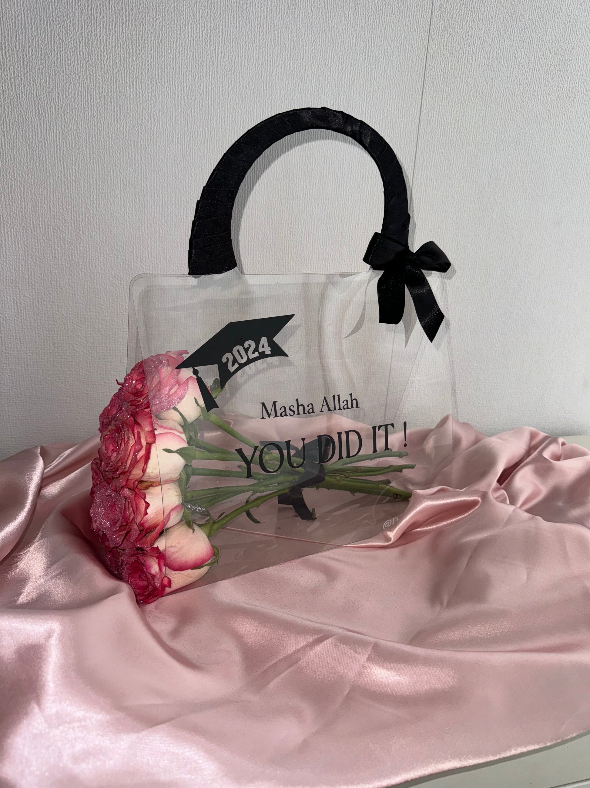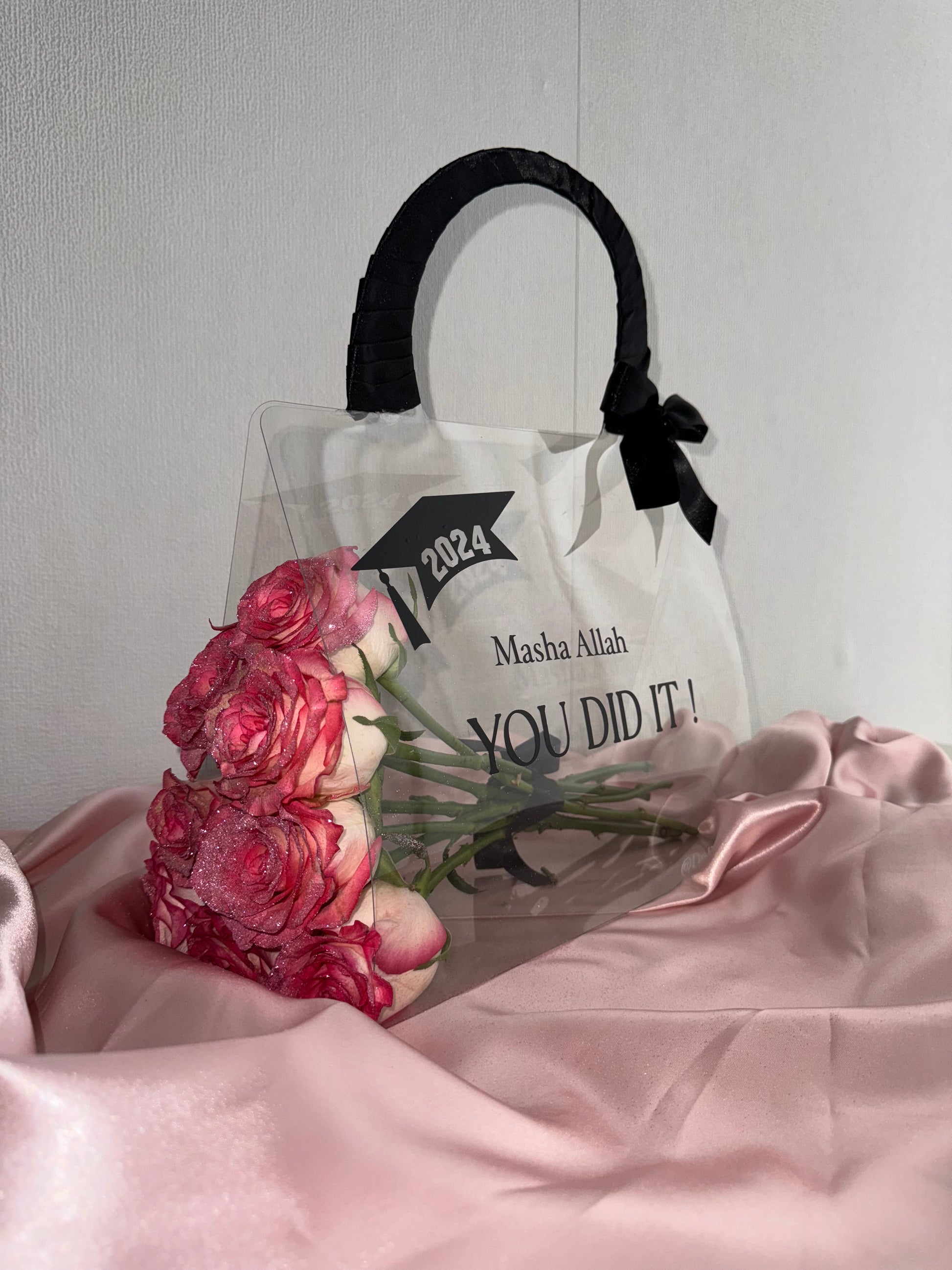 Een ‘luxury roses bag’ in geslaagd thema is het perfecte cadeau. Het is een stijlvolle manier om rozen te geven op haar diploma-uitreiking, en de tas blijft daarna een mooie herinnering aan die bijzondere mijlpaal.