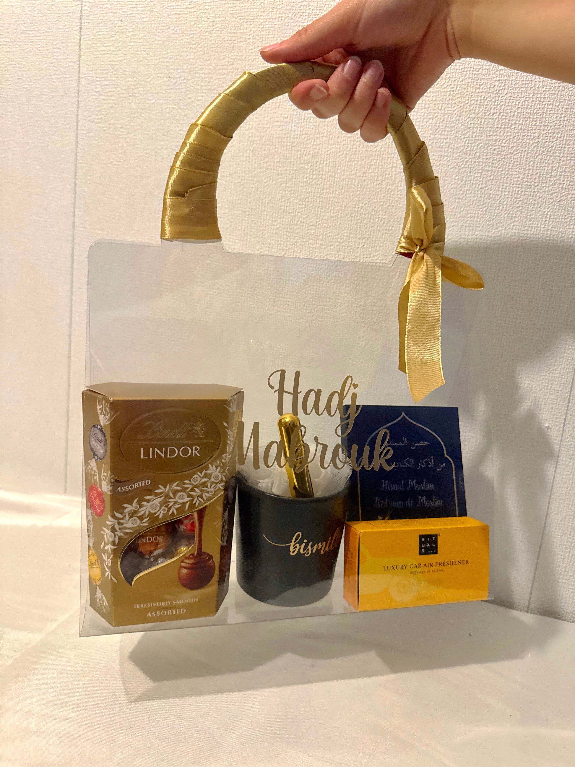 Verwelkom je familie/vrienden die terug zijn van de Hadj met onze luxe Hadj Giftbag, handgemaakt en voorzien van de warme boodschap “Hadj Mubarak”.